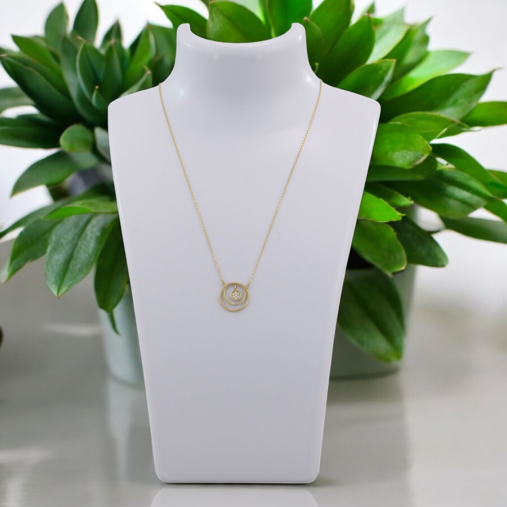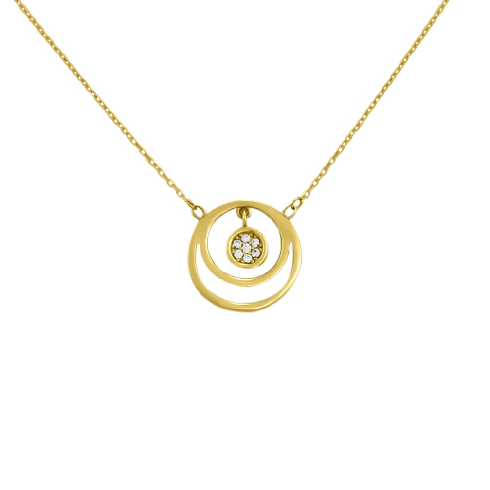 Náhrdelník zo 14 karátového zlata, s dvoma excentrickými príveskami v tvare obrúčky, uprostred so trblietavým kryštálom.