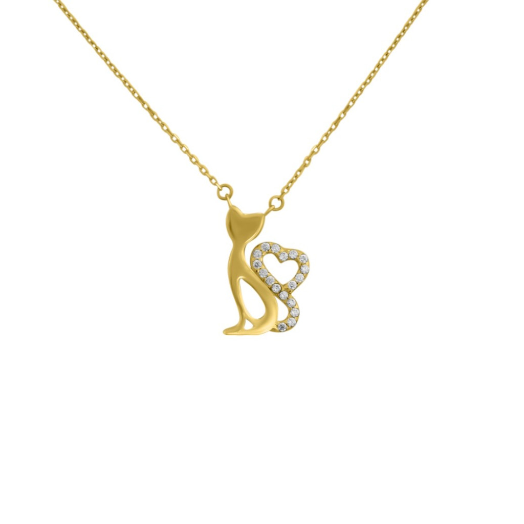 Náhrdelník vyrobený zo 14 karátového zlata s príveskom s vyobrazením mačky, zdobený kryštálmi.