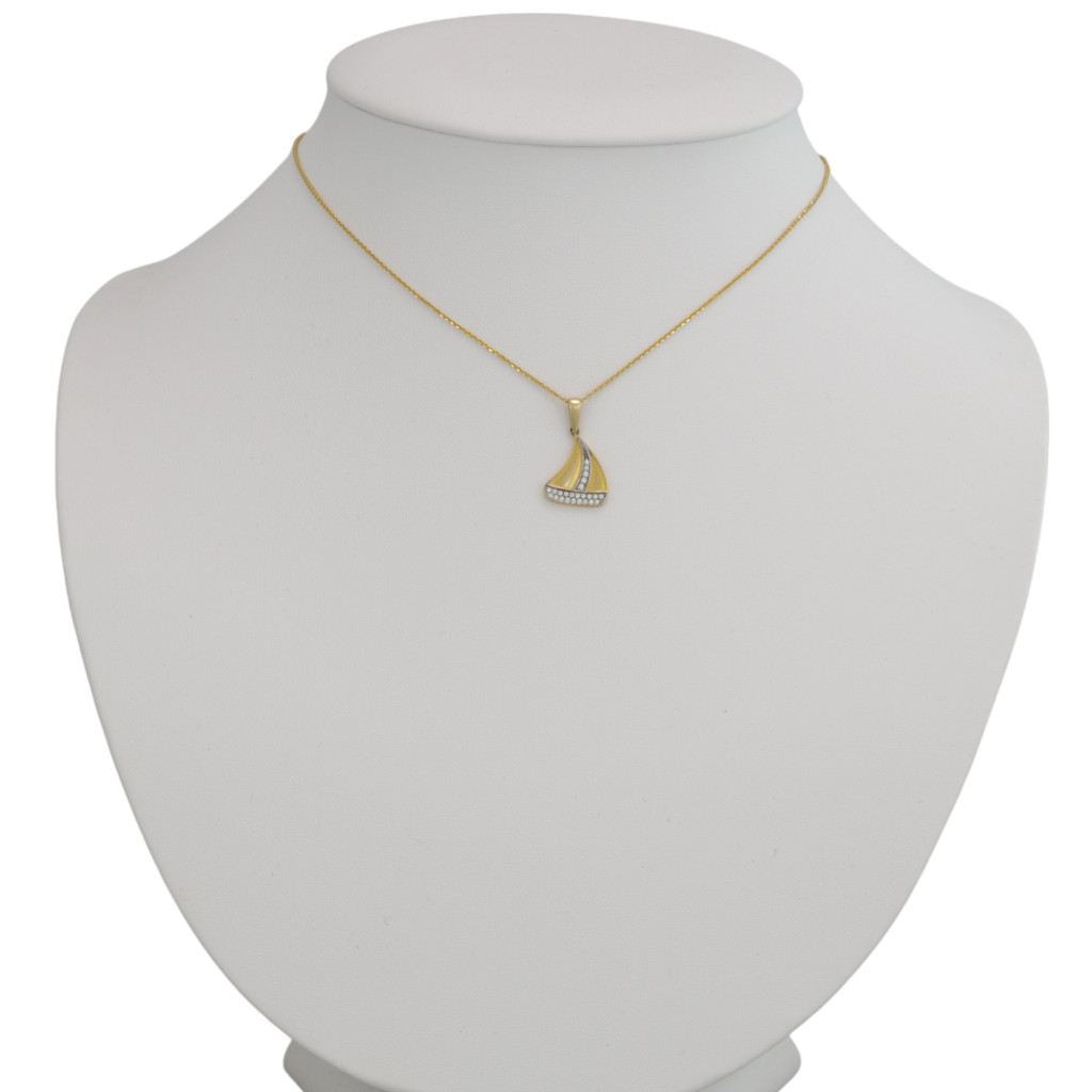 Prívesok znázorňujúci plachetnicu zo 14 karátového zlata zdobený kryštálmi.