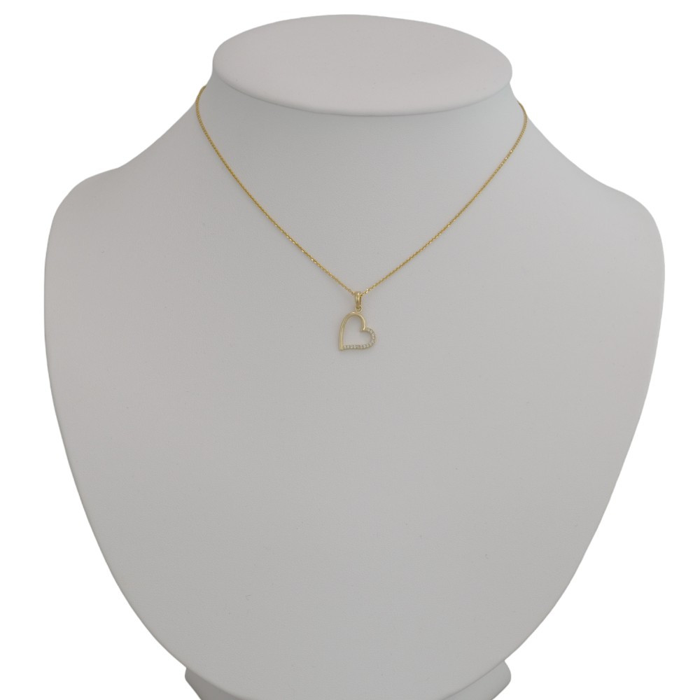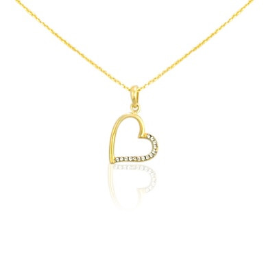 Prívesok zobrazujúci šikmo visiace srdce, vyrobený zo 14 karátového zlata, na jednej časti zdobený trblietavými kryštálmi.