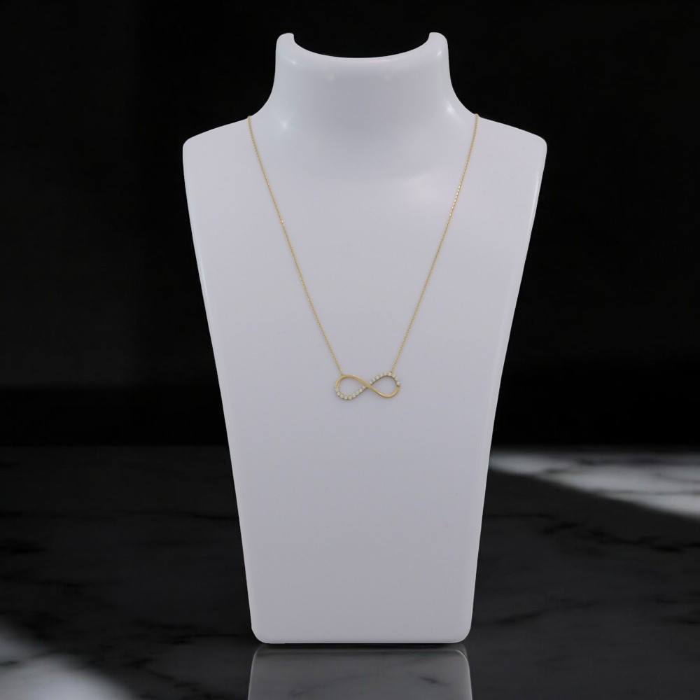 Náhrdelník vyrobený zo 14 karátového zlata, s príveskom nekonečna, zdobený kryštálmi.