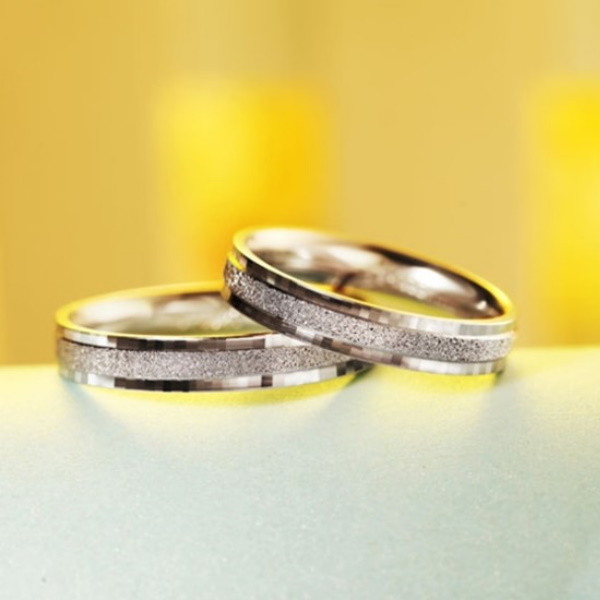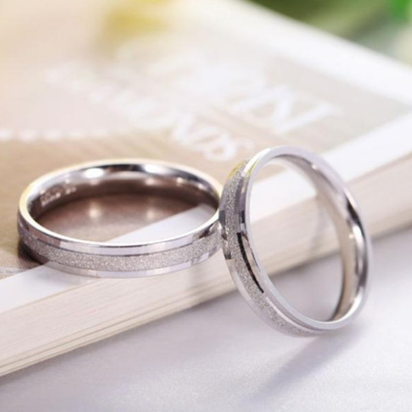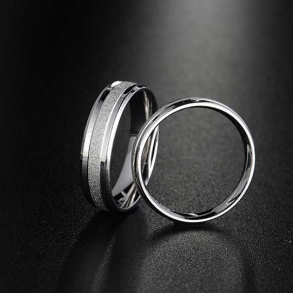 Dámska svadobná obrúčka vyrobená zo striebra, v strede zdobená pásikom. Hmotnosť 2,3 g.