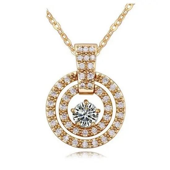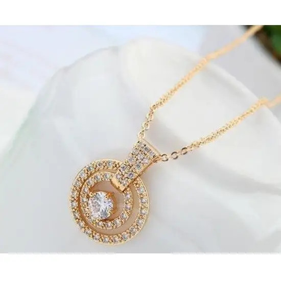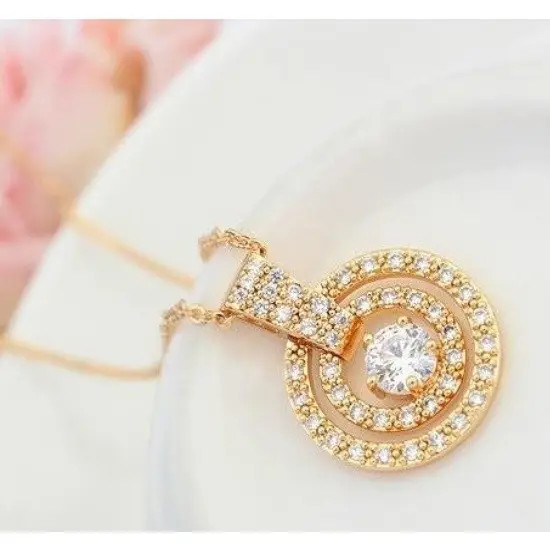 Módny náhrdelník s trojitým kruhovým príveskom z medi, so zirkónovými kamienkami.