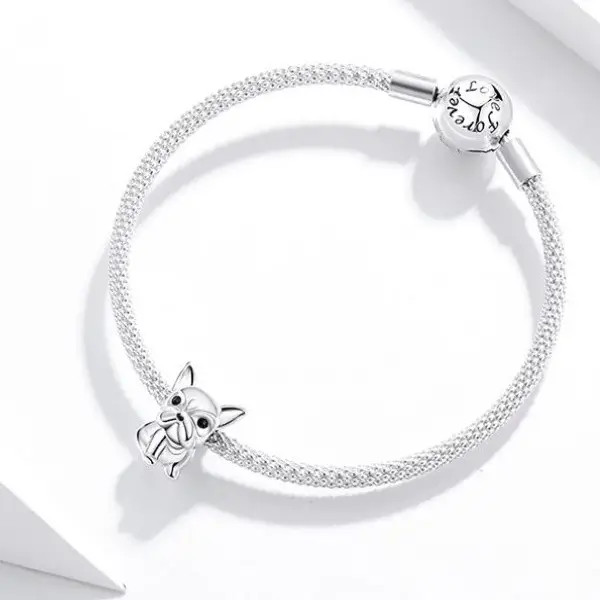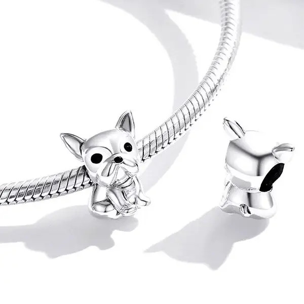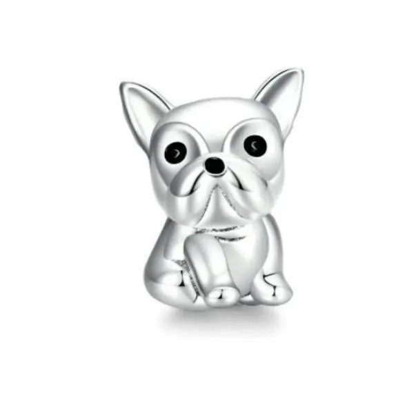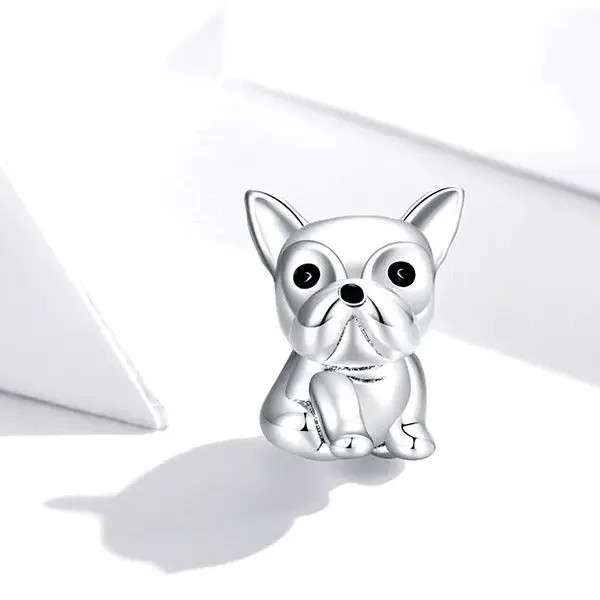 Prívesok v tvare buldoga vyrobený zo striebra. Dá sa nosiť na náhrdelníku alebo náramku. Veľkosť 1,3 x 1 cm, hmotnosť cca. 2 g.