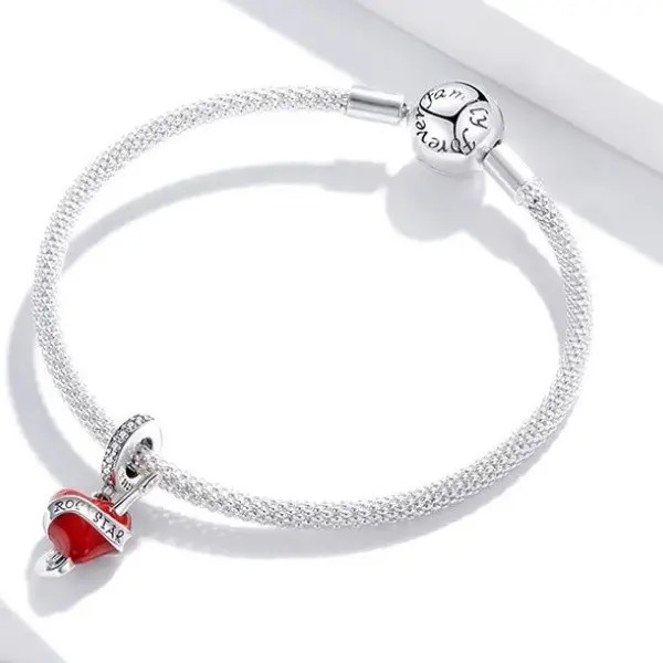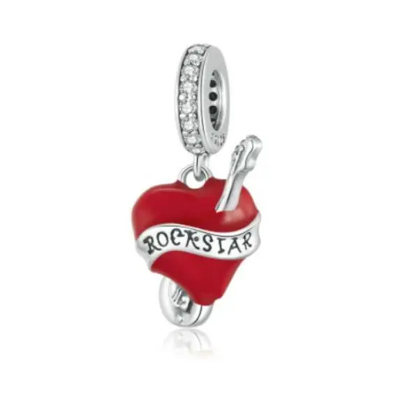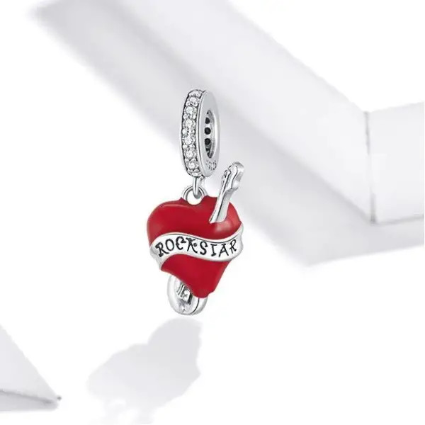 Strieborný prívesok v tvare elektrickej gitary s červeným srdcom. Dá sa nosiť na náhrdelníku alebo náramku. Veľkosť 2 x 0,9 cm.