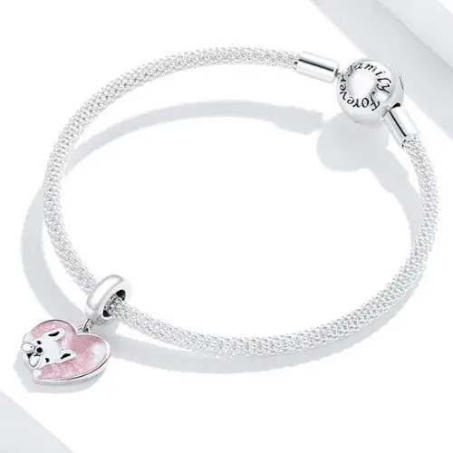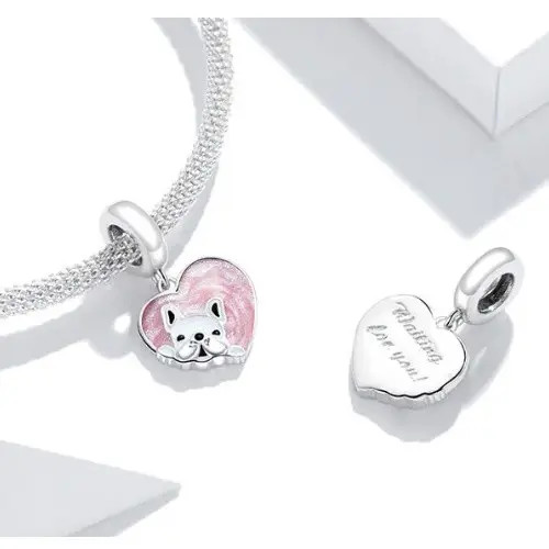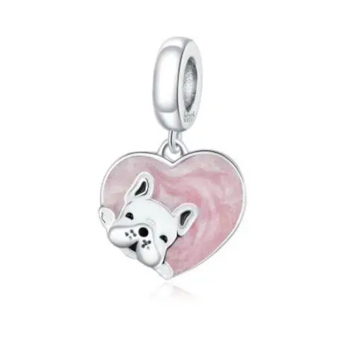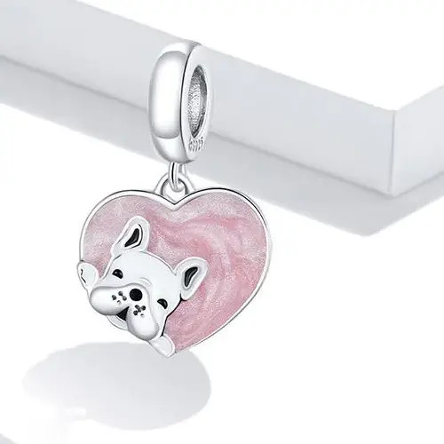 Strieborný prívesok zobrazujúci ružové srdce s malým psíkom vo vnútri. Dá sa nosiť na náramku alebo náhrdelníku. Veľkosť 2,1 x 1,3 cm.