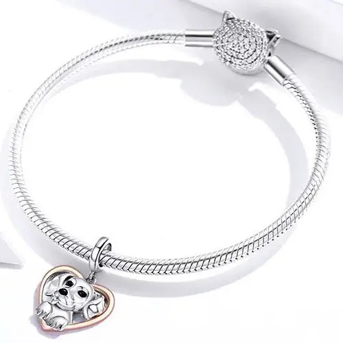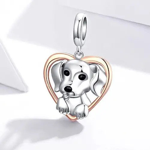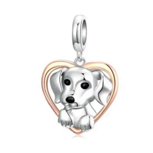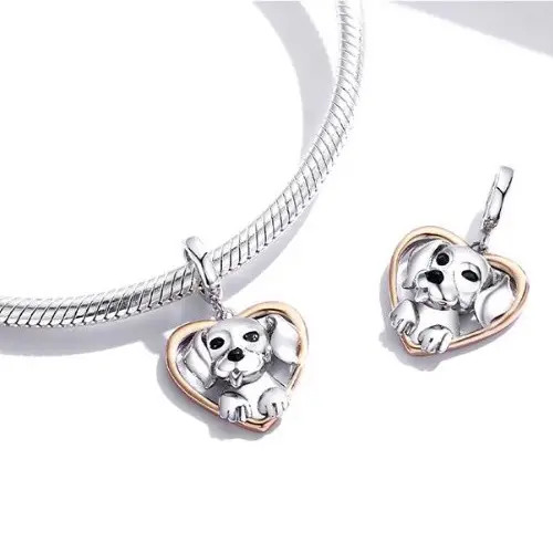 Strieborný prívesok zobrazujúci ružovo zlaté srdce s malým psíkom vo vnútri. Dá sa nosiť na náramku alebo náhrdelníku. Veľkosť 2,1 x 1,4 cm.