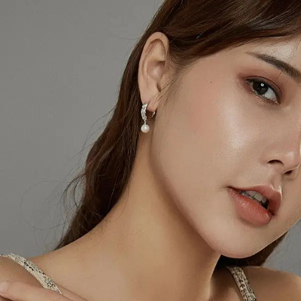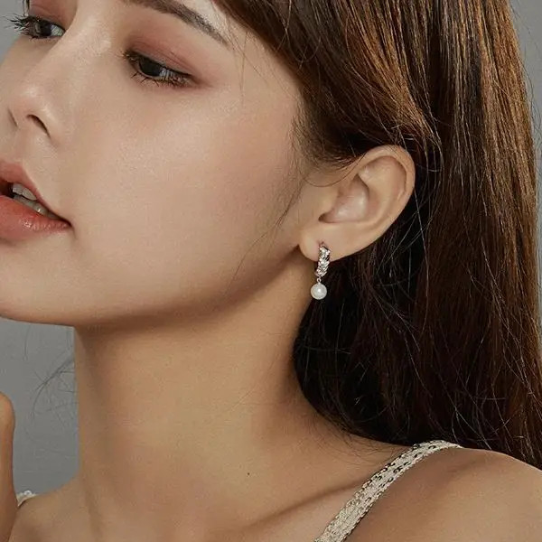 Elegantné strieborné náušnice zdobené kryštálmi zirkónu a bielymi perlami. Veľkosť 2,2 x 0,6 cm, váha 3,1 g.