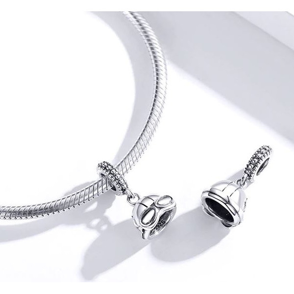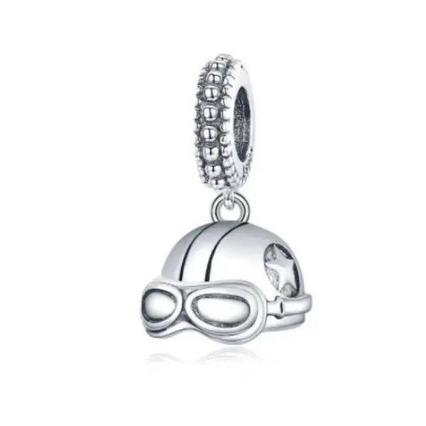 Motorkársky prívesok na prilbu v retro štýle vyrobený zo striebra na náramky a náhrdelníky. Veľkosť 1,8 x 1 cm Prívesok je kompatibilný s náramkami typu Pandora a Pandora.