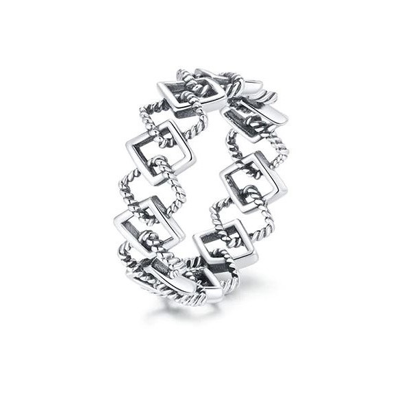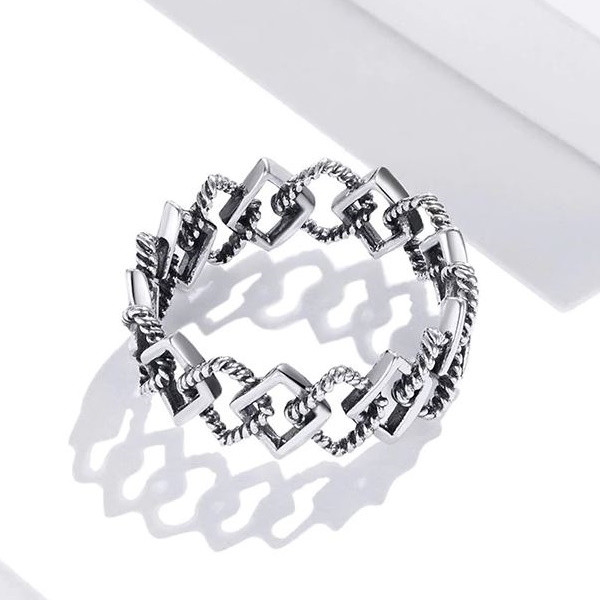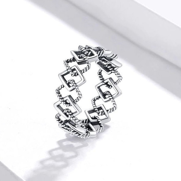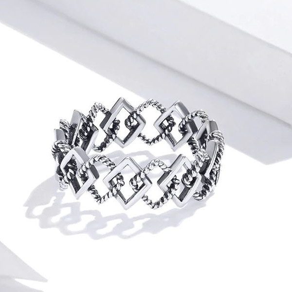 Zásnubný prsteň zo striebra, geometrický vzor, retro štýl. Jeho hrúbka je 0,7 cm.