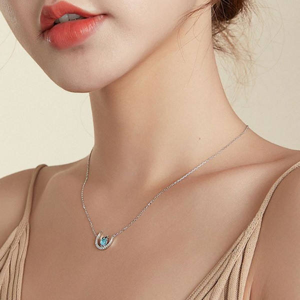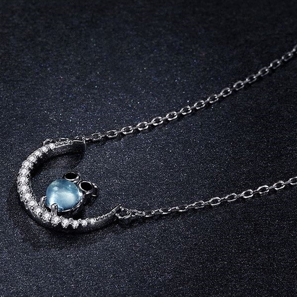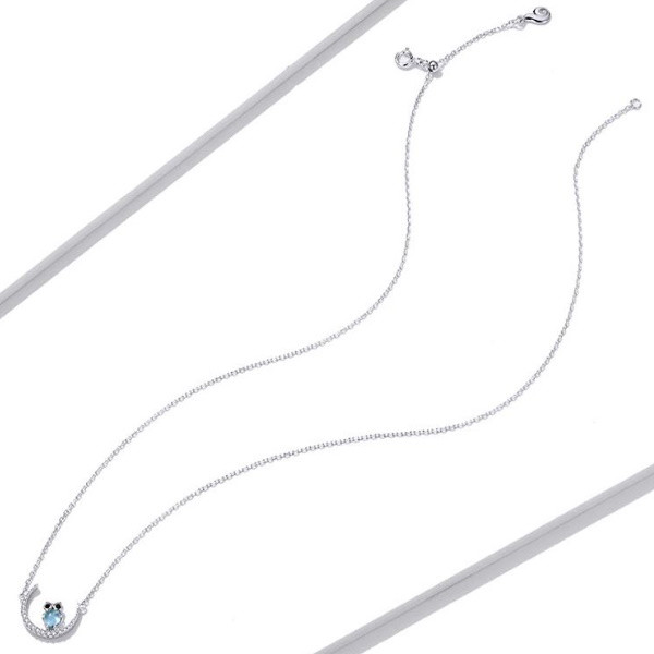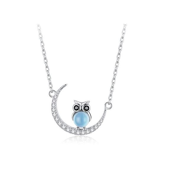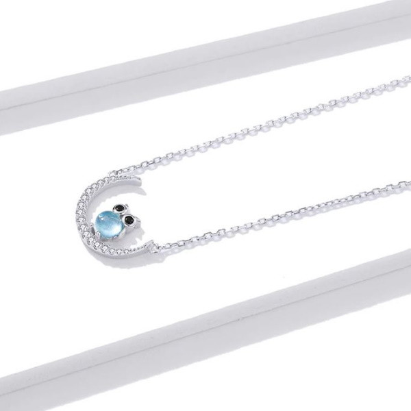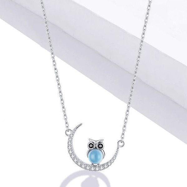 Náhrdelník zo striebra s príveskom zobrazujúcim sovu sediacu na mesiaci. Prívesok je zdobený drobnými zirkónovými kamienkami a modrou sklenenou korálkou. Retiazka je dlhá 45 cm a váži 2,2 g.