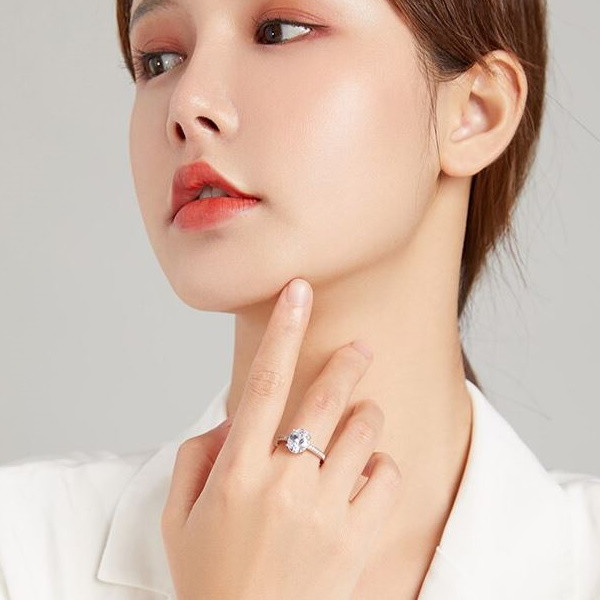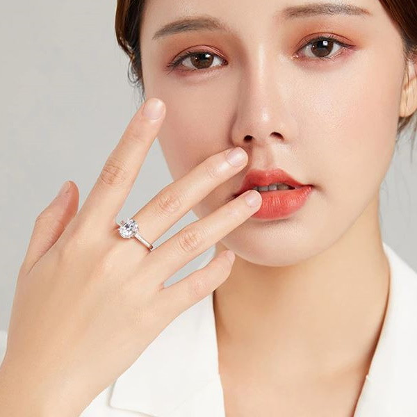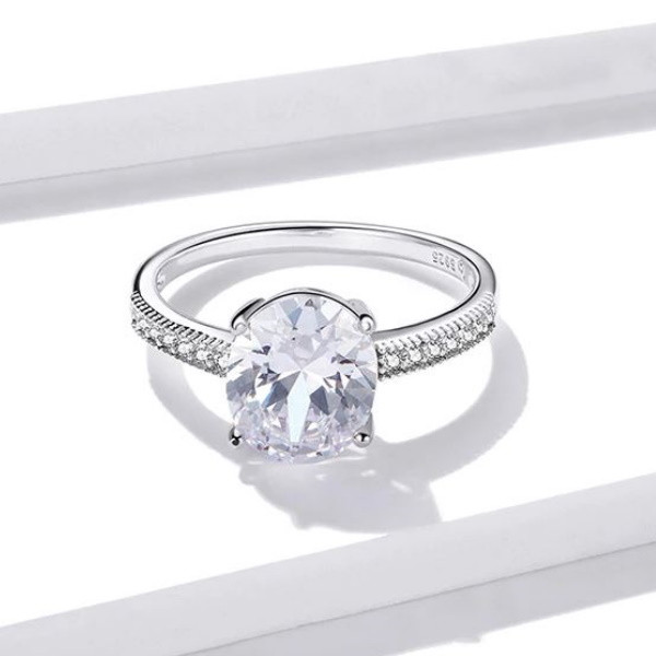 Zásnubný prsteň vyrobený zo striebra, zdobený bielym zirkónovým kryštálom. Hrúbka 1,15 cm, váha 2,7 g.