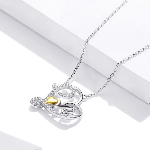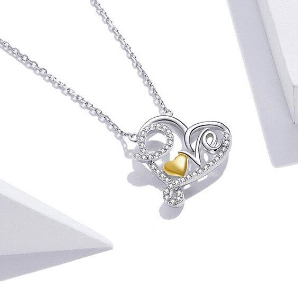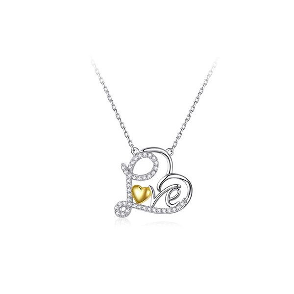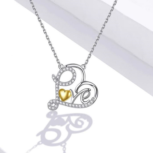 Náhrdelník zo striebra, zdobený zirkónovým kryštálom, prívesok v tvare srdca s nápisom LOVE. Dĺžka retiazky je 45 cm, veľkosť prívesku je 1,8 x 1,7 cm. Hmotnosť 2,7 g.