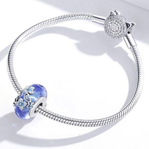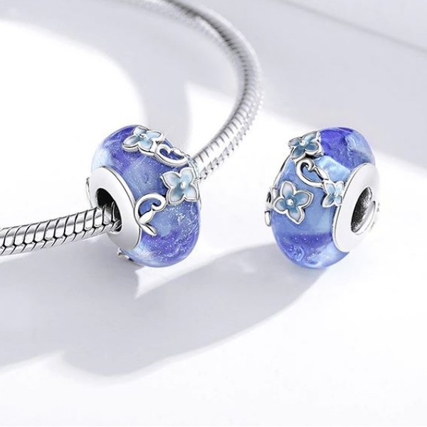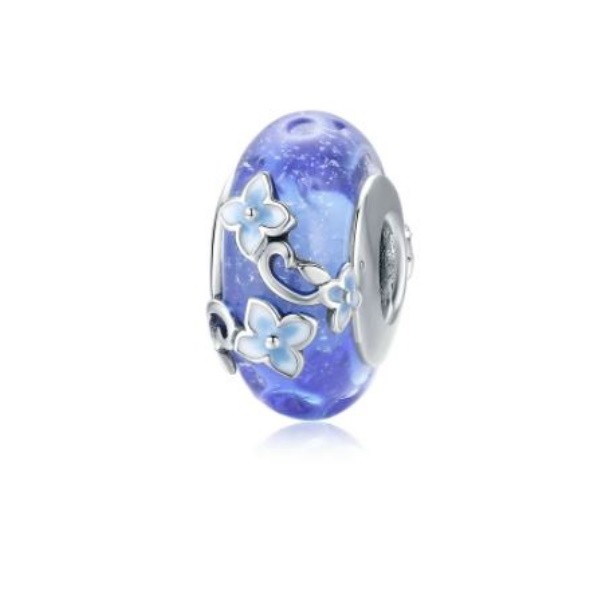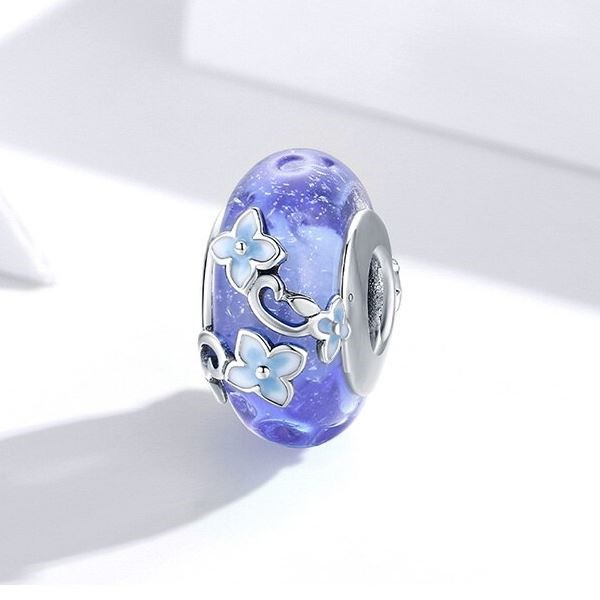 Zdobené pôvabnými kvetmi zo striebra a skla. Dá sa nosiť na náramku alebo náhrdelníku. Veľkosť 1,8 × 0,9 cm Prívesok je kompatibilný s náramkami typu Pandora a Pandora.