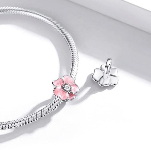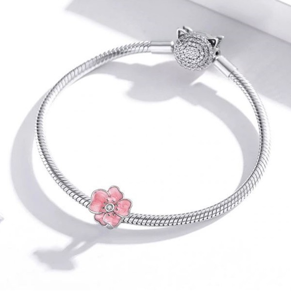 Vyrobené zo striebra, zdobené ružovým smaltom a bielym zirkónovým kryštálom, na prívesný náramok a náhrdelník. Veľkosť 1,1 × 1,0 cm Prívesok je kompatibilný s náramkami typu Pandora a Pandora.