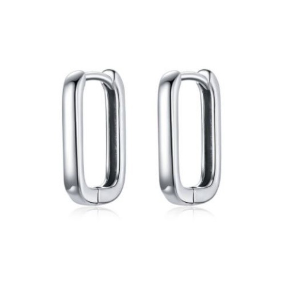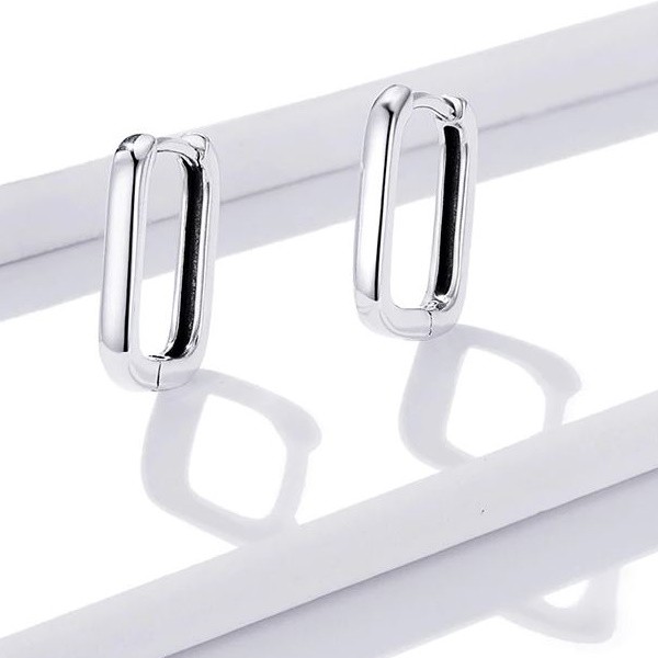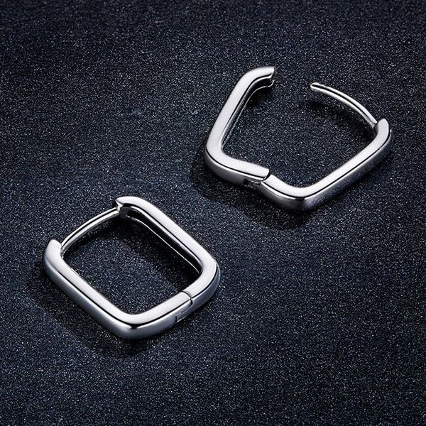 Štvorcové dámske náušnice vyrobené zo striebra, s hladkými líniami. Veľkosť 1,3 × 1,2 cm, hmotnosť cca. 1,5 g.