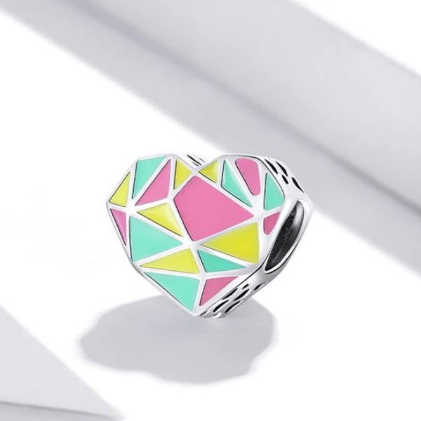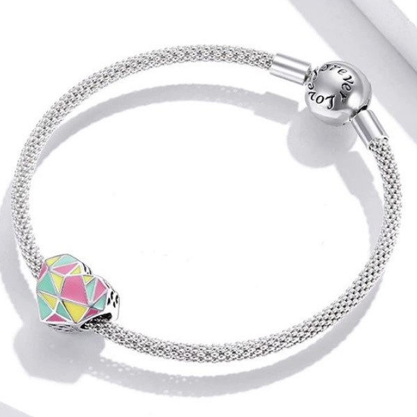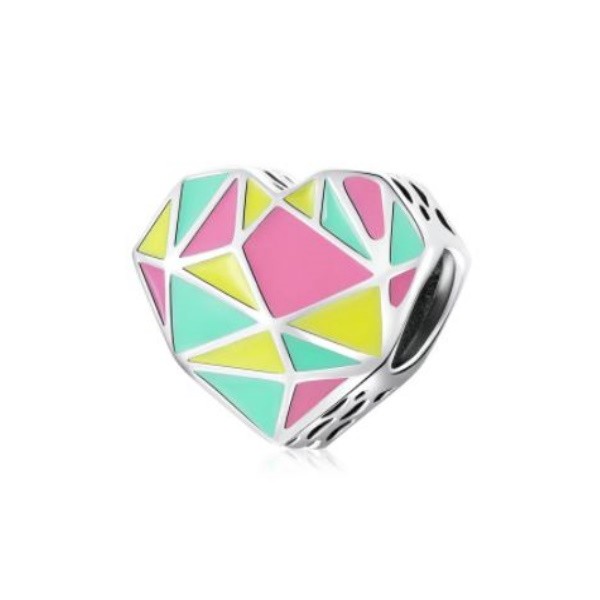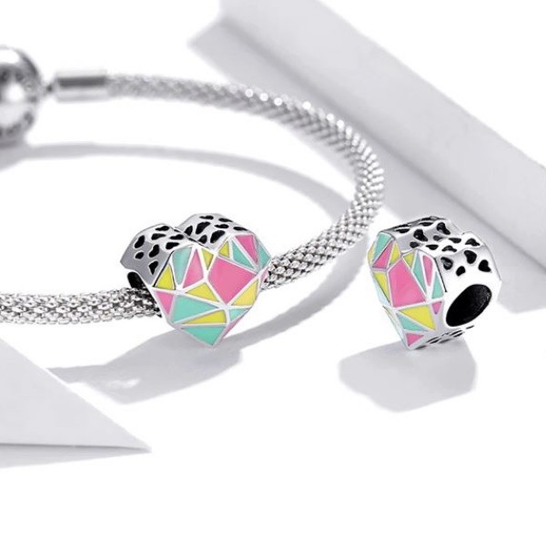 Prívesok vyrobený zo striebra, zdobený farebným smaltom s geometrickým vzorom. Dá sa nosiť na náramku alebo náhrdelníku. Veľkosť 1,1 × 1,2 cm Prívesok je kompatibilný s náramkami typu Pandora a Pandora.