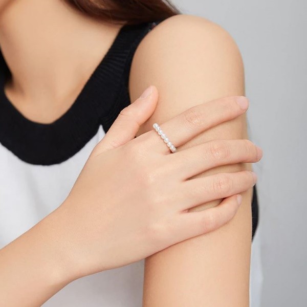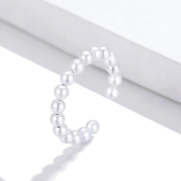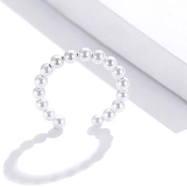 Dámsky prsteň vyrobený zo strieborných a bielych perál, ktorý je možné nosiť aj ako náušnice. Veľkosť 2,2 × 2,1 cm, hmotnosť cca. 0,8 g.