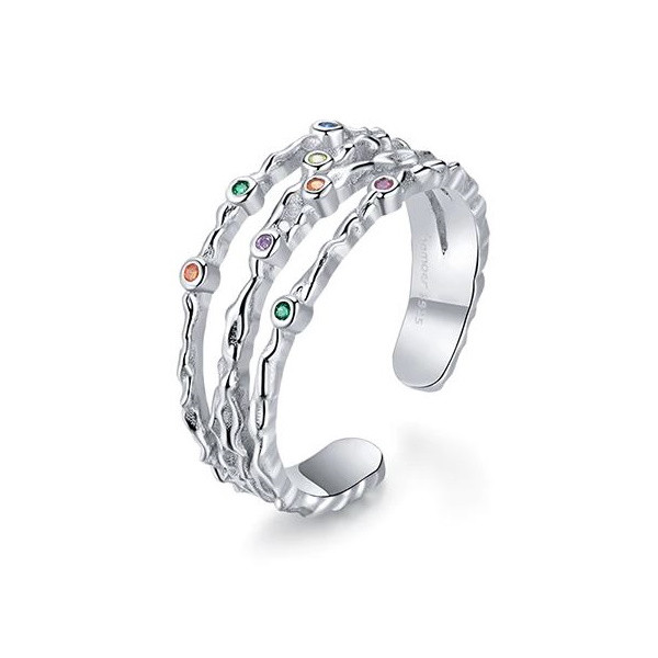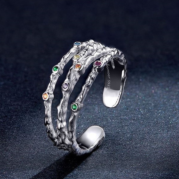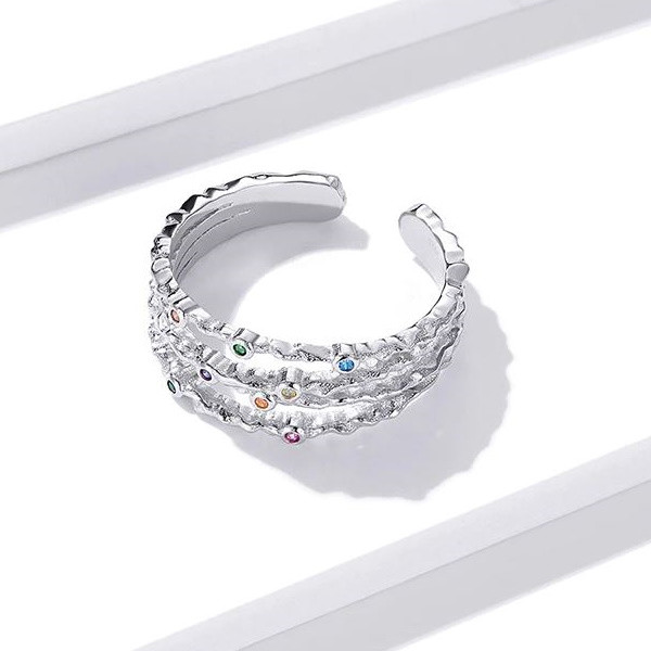 Prsteň zo striebra, nastaviteľná veľkosť, zdobený farebnými zirkónovými kamienkami. Veľkosť 0,4-0,8 cm, váha 2,6 g.