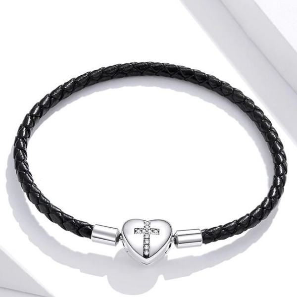 Náramok zo striebra a kože, zdobený zirkónovým kryštálom na zapínaní. Dĺžka 17 cm, váha 4,1 g, rozmer zapínania 0,9 × 1,0 cm.