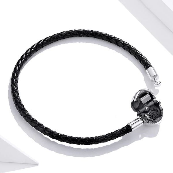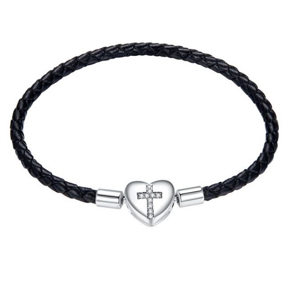 Náramok zo striebra a kože, zdobený zirkónovým kryštálom na zapínaní. Dĺžka 19 cm, váha 4,1 g, rozmer zapínania 0,9 × 1,0 cm.