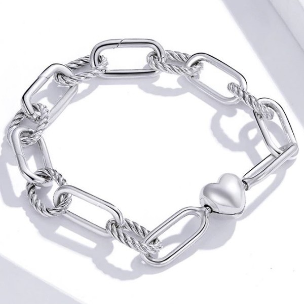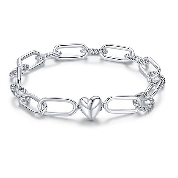 Srdiečkový náramok z veľkých strieborných retiazkových očiek. Dĺžka 19 cm, váha 16,6 g Rozmer srdiečka je 0,9 × 01 cm.