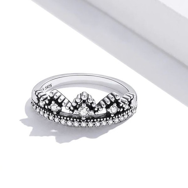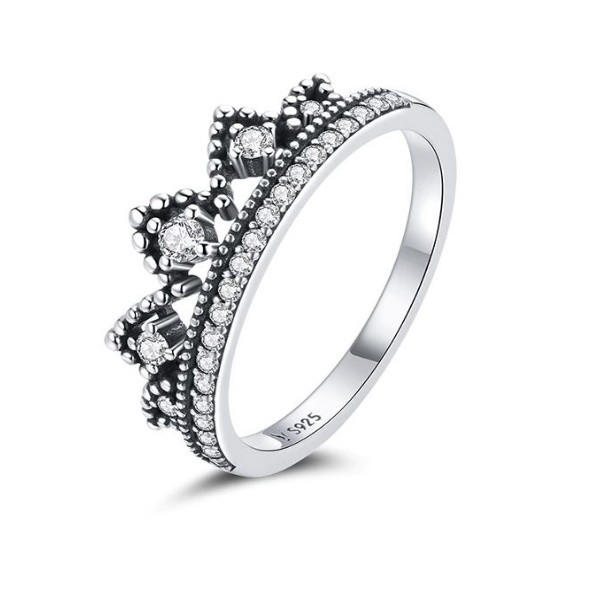 Elegantný dámsky prsteň vyrobený zo striebra, v tvare korunky, zdobený kryštálom zirkónu. Jeho šírka je 0,5 cm, veľkosť motívu korunky je 0,7 × 1,9 cm, váha cca. 2,3 g.