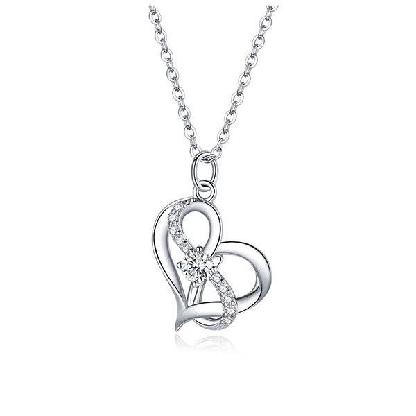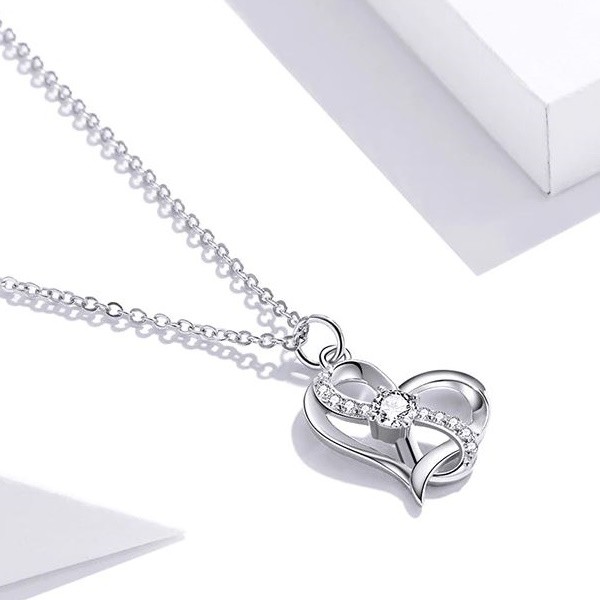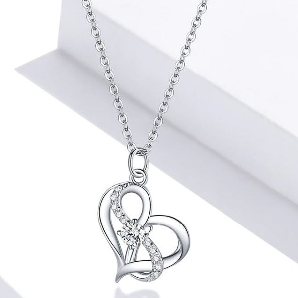 Náhrdelník zo striebra s príveskom zdobeným bielym zirkónovým kryštálom, na ktorom je vyobrazené srdce prepletené symbolom nekonečna. Retiazka je dlhá 45 cm a váži 2,7 g. Veľkosť prívesku je 1,5 × 1,5 cm.
