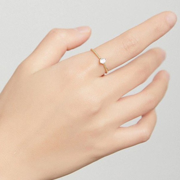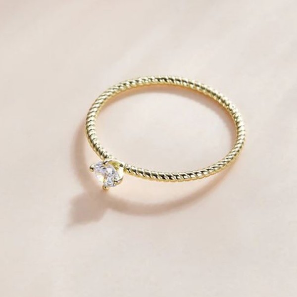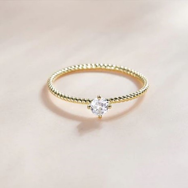 Točený dámsky prsteň vyrobený zo striebra s pozlátením a bielym zirkónovým kryštálom. Šírka 0,12 cm, hmotnosť cca. 0,6 g.