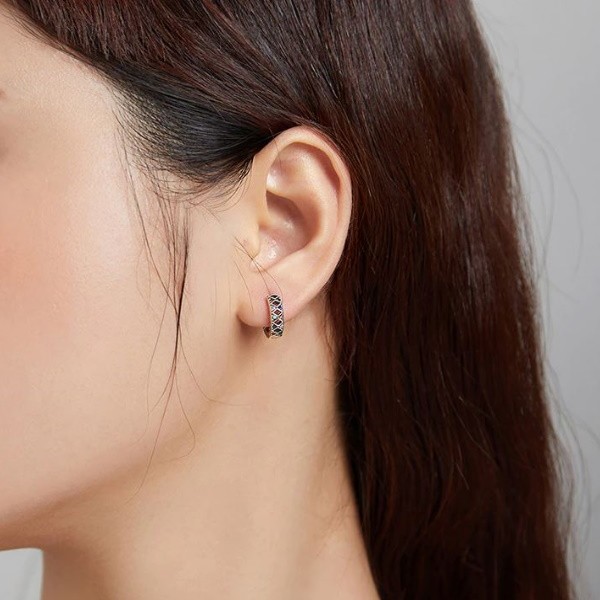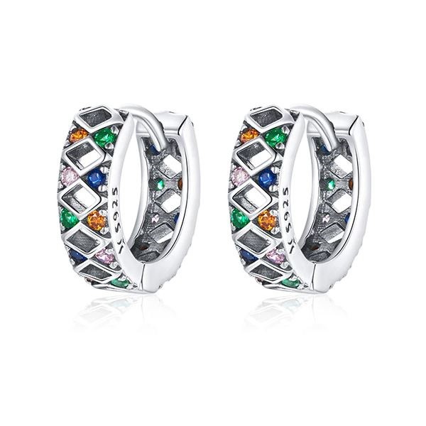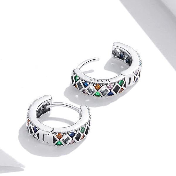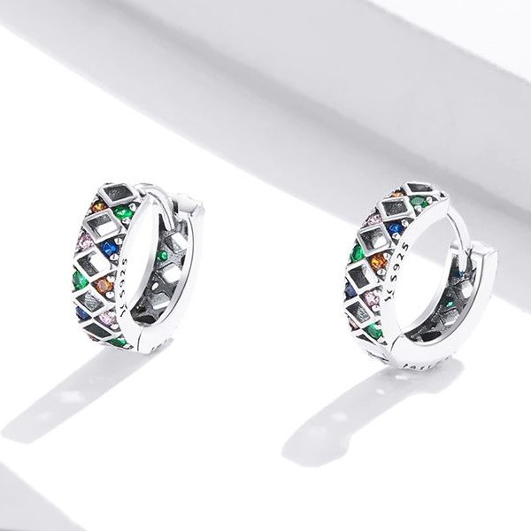 Dámske náušnice vyrobené zo striebra, zdobené farebnými zirkónovými kryštálmi a kosoštvorcovými vzormi. Veľkosť 1,3 × 0,38 cm, hmotnosť cca. 2,3 g.