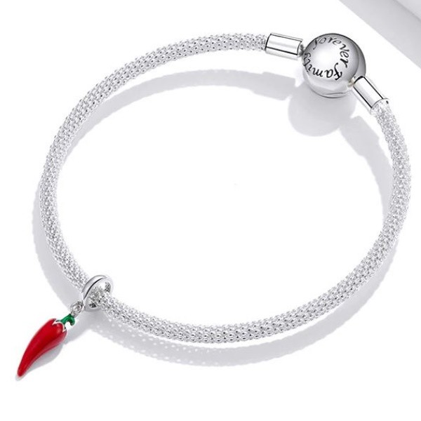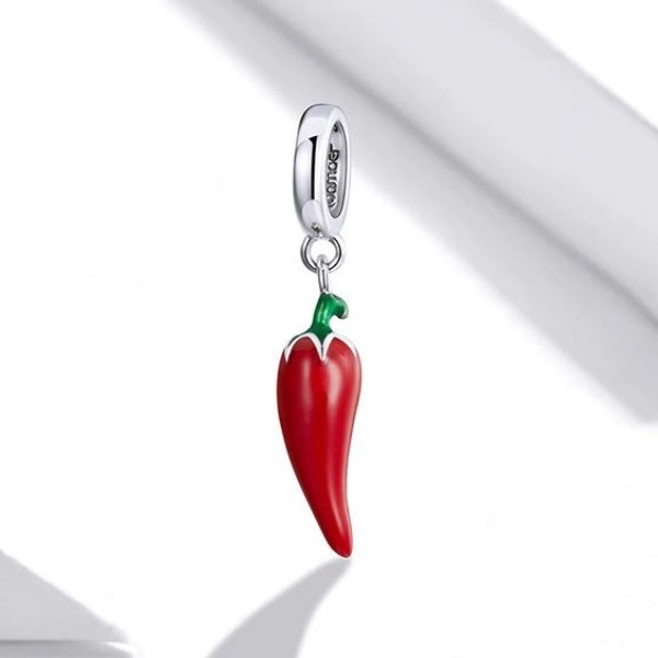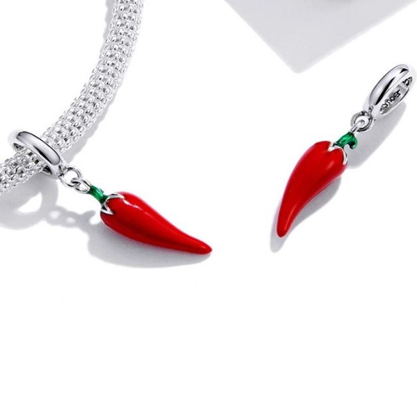 Vyrobené zo striebra s vyobrazením čili papričky na náramku a náhrdelníku. Veľkosť 2,2 × 0,4 cm Prívesok je kompatibilný s náramkami typu Pandora a Pandora.