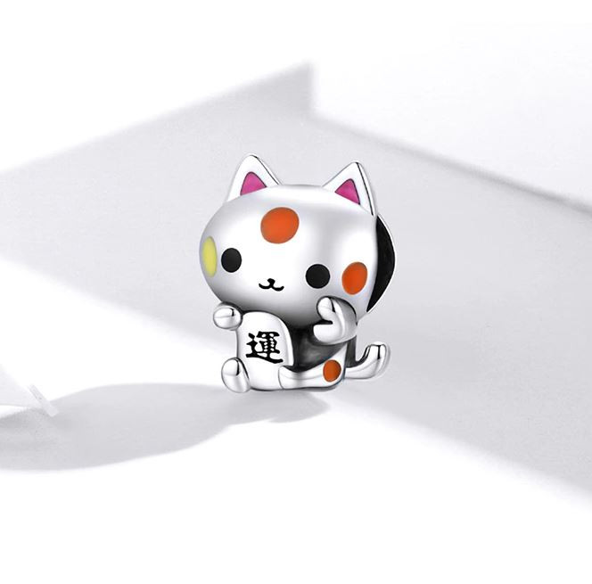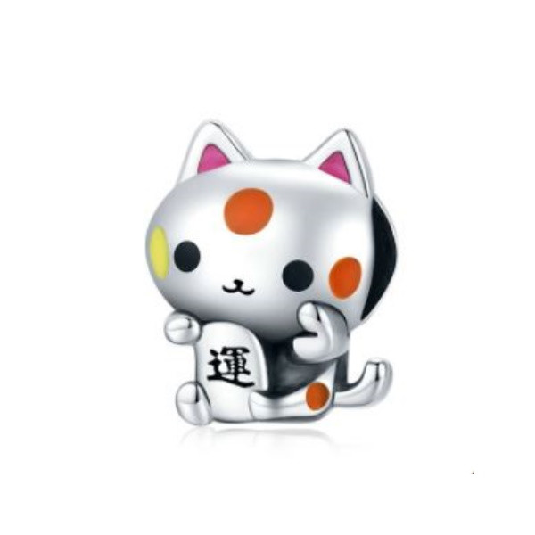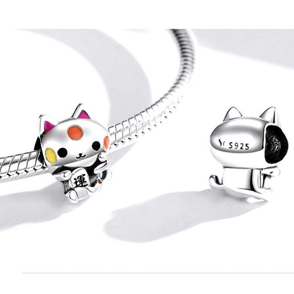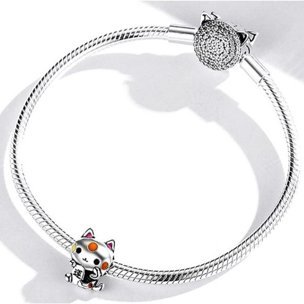 Prívesok vyrobený zo striebra, zobrazujúci milú mačku, zdobený farebným smaltom. Dá sa nosiť na náramku alebo náhrdelníku. Veľkosť 1,1 × 0,9 cm Prívesok je kompatibilný s náramkami typu Pandora a Pandora.