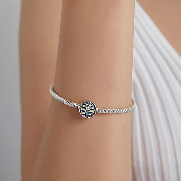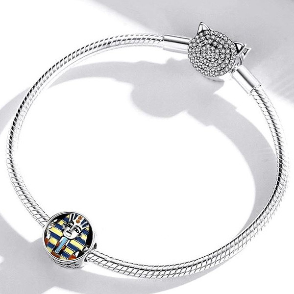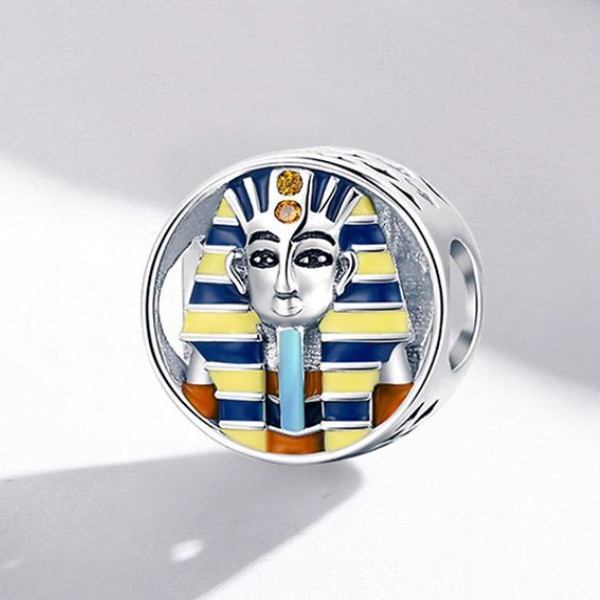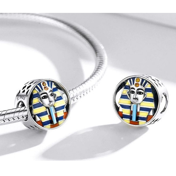 Prívesok zobrazujúci faraóna vyrobený zo striebra s farebným smaltovaným zdobením a zirkónovým kryštálom. Dá sa nosiť na náramku alebo náhrdelníku. Veľkosť 1,1 × 1,1 cm, hmotnosť cca. 2 g.