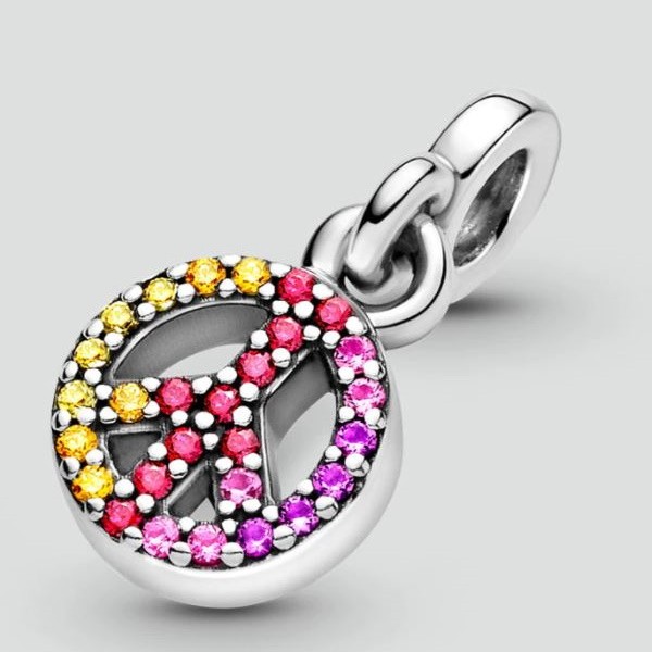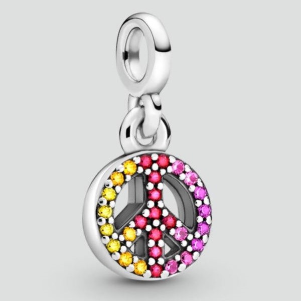 Vyrobené zo striebra, zdobené farebnými zirkónovými kryštálmi, znázorňujúcimi znamenie mieru, na malom, nerušivom náramku a náhrdelníku.