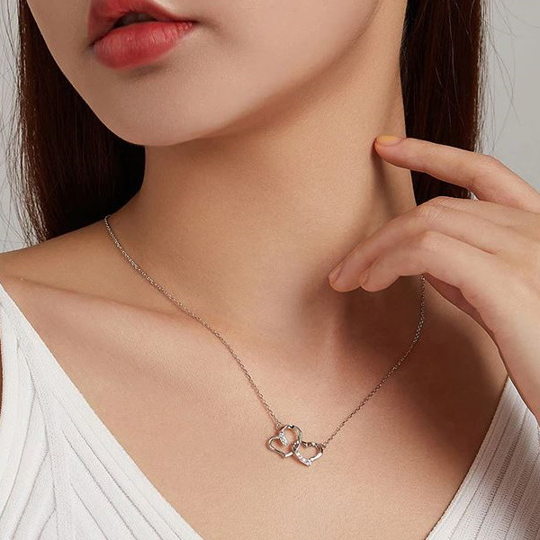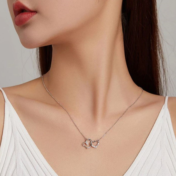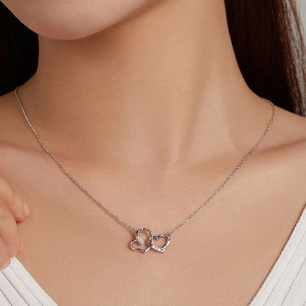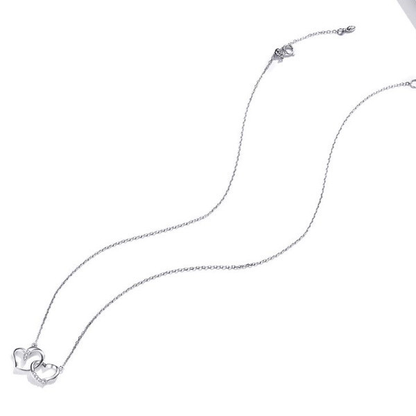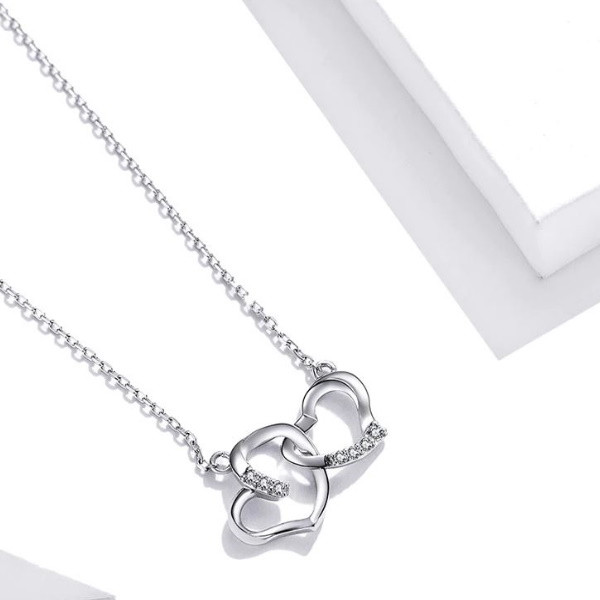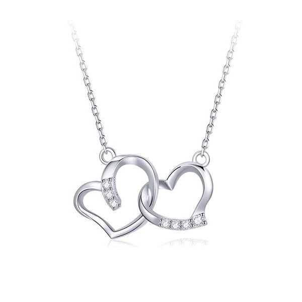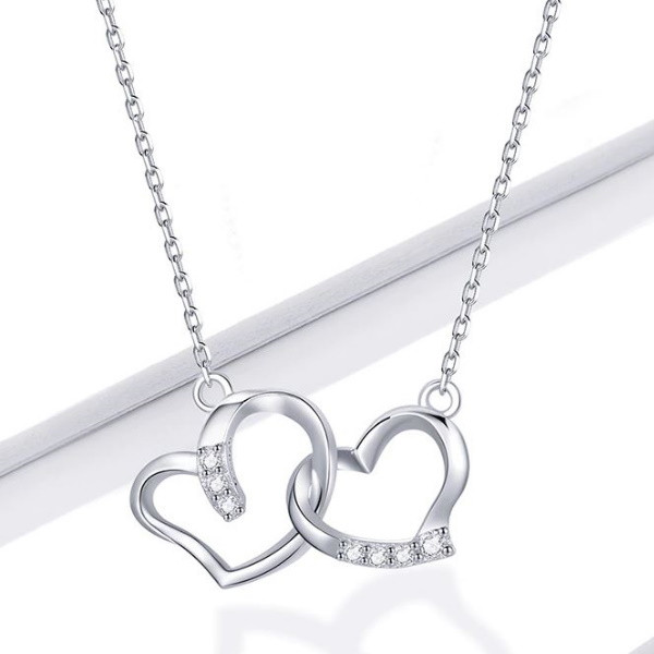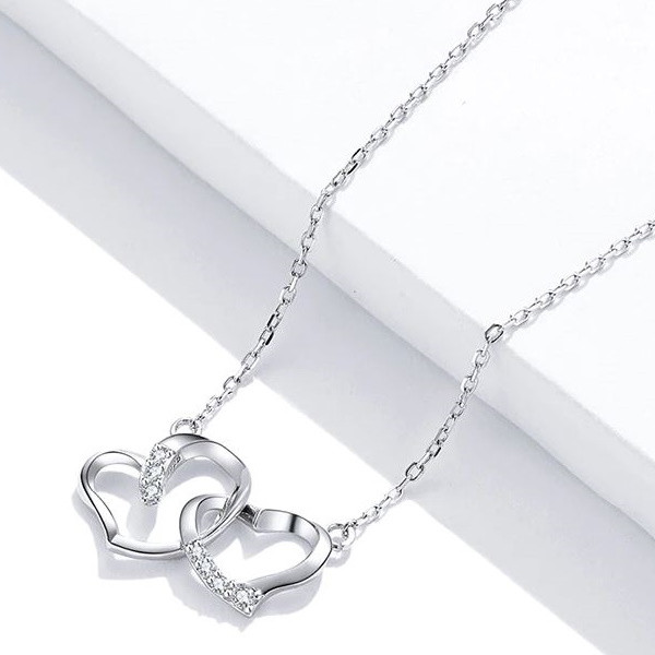 Náhrdelník zo striebra, s príveskom znázorňujúcim prepletené srdiečka, zdobený zirkónovým kryštálom. Retiazka je dlhá 45 cm a váži 2,4 g. Veľkosť prívesku je 1,2 × 2 cm.