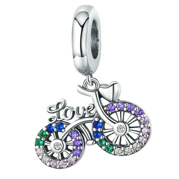 Vyrobené zo striebra, zdobené nápisom LOVE a farebným zirkónovým kryštálom, na náramku a náhrdelníku na bicykli. Jeho výška je cca. 10 mm, hmotnosť cca. 2 g Prívesok je kompatibilný s náramkami typu Pandora a Pandora.