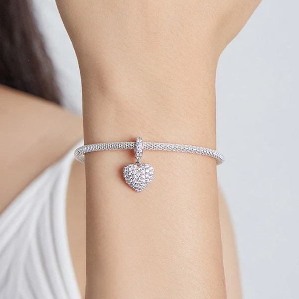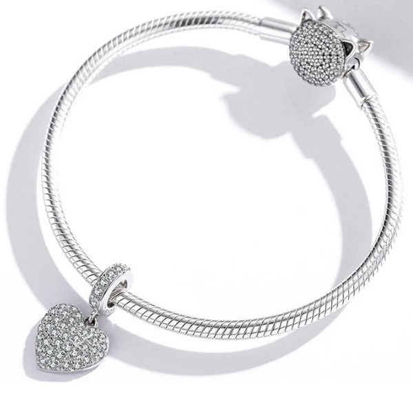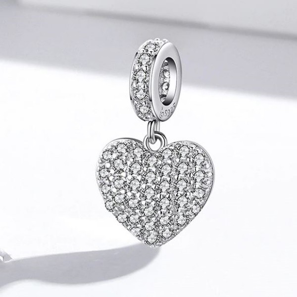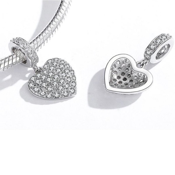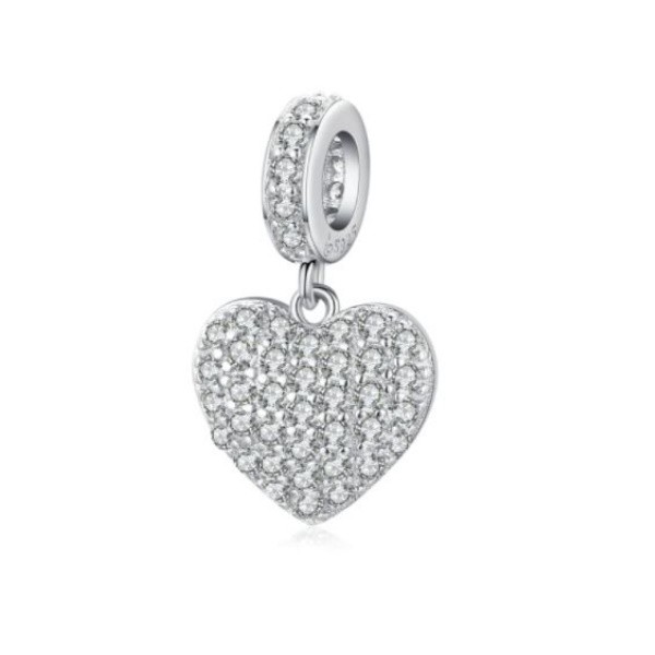 Prívesok v tvare srdca vyrobený zo striebra, vykladaný bielym kryštálom zirkónu. Dá sa nosiť na náramku alebo náhrdelníku. Veľkosť 1,7 × 1,2 cm, váha 1,9 g Prívesok je kompatibilný s náramkami typu Pandora a Pandora.