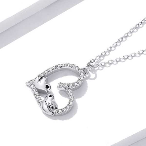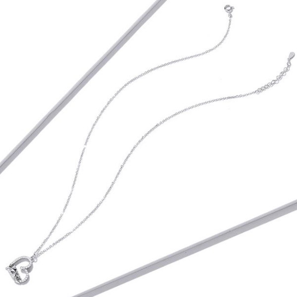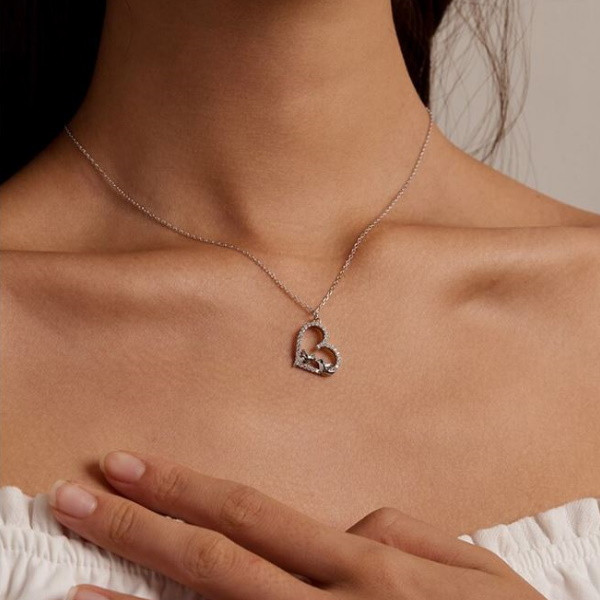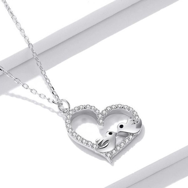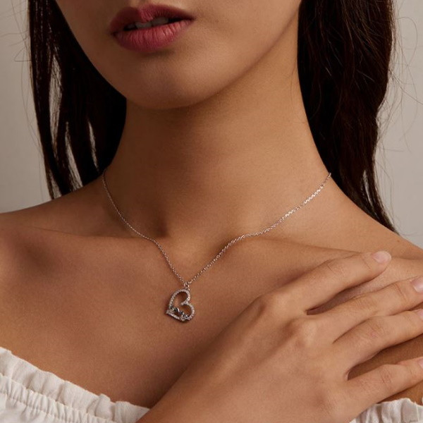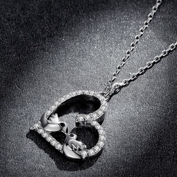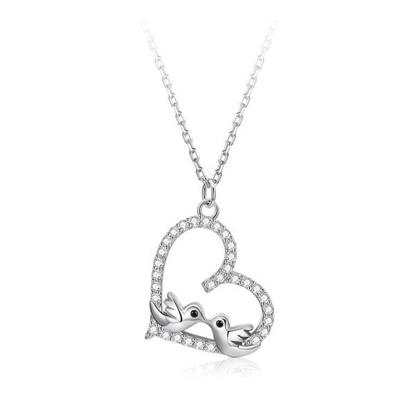 Náhrdelník v tvare srdca zo striebra s príveskom zdobeným dvoma malými vtáčikmi a bielym zirkónovým kryštálom. Dĺžka retiazky je 43 cm, veľkosť prívesku je 1,8 × 1,6 cm. Hmotnosť 2,5 g.