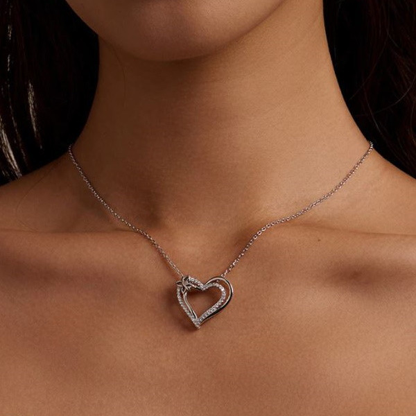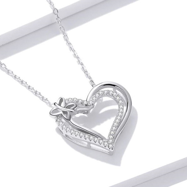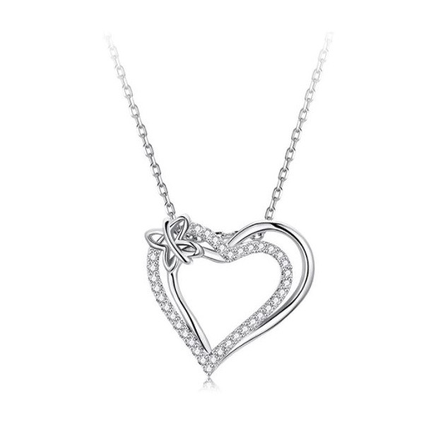 Strieborný náhrdelník s príveskom s dvojitým srdcom a motýľom