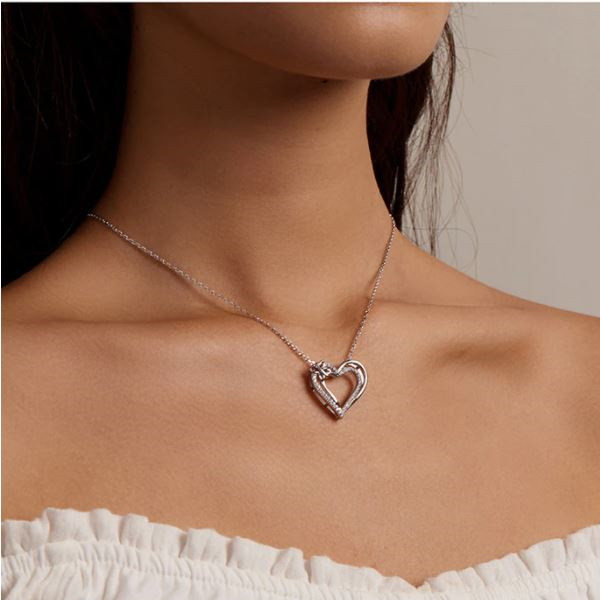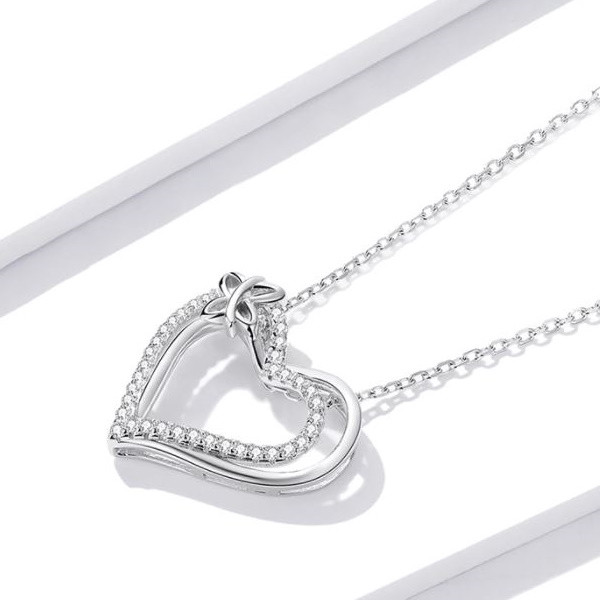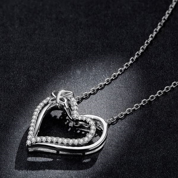 Strieborný náhrdelník s príveskom s dvojitým srdcom zdobeným zirkónovým kryštálom. Dĺžka náhrdelníka je 43 cm, veľkosť prívesku je 2,3 × 2,4 cm. Hmotnosť 5,2 g.