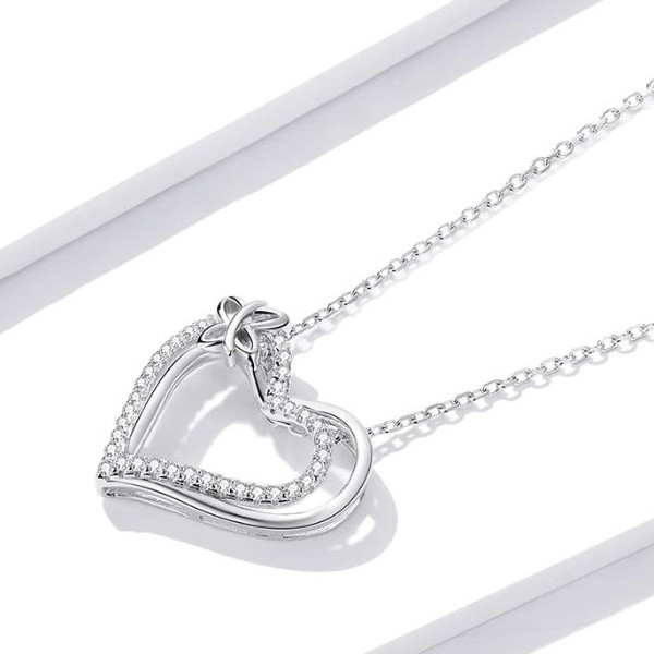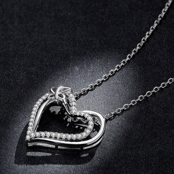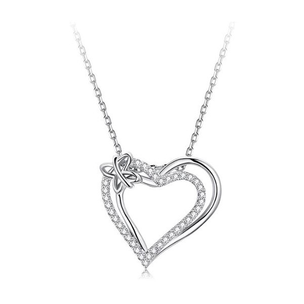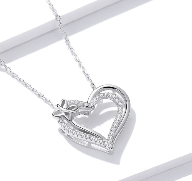 Strieborný náhrdelník s dvojitým srdcom, prívesok motýľ