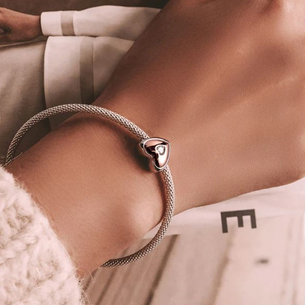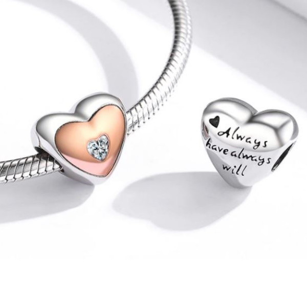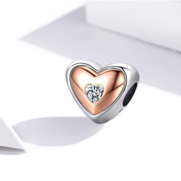 Srdiečkové kúzlo zo striebra, zdobené zirkónovým kryštálom, na náramok a náhrdelník. Jeho rozmer je 1,1 × 1,3 cm, priemer dierky v ňom je 0,45 cm. Prívesok je kompatibilný s náramkami typu Pandora a Pandora.