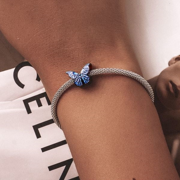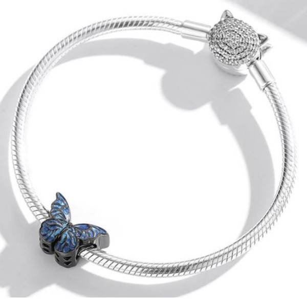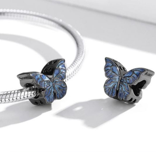 Elegantný motýľový náramok a náhrdelník zo striebra, zdobený smaltom. Jeho rozmer je 1 × 1,4 cm, priemer otvoru v ňom je 0,45 cm. Hmotnosť 2,6 g Prívesok je kompatibilný s náramkami typu Pandora a Pandora.