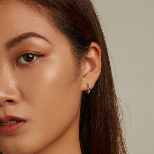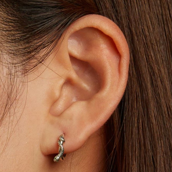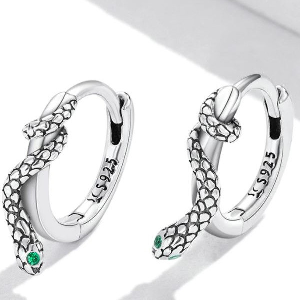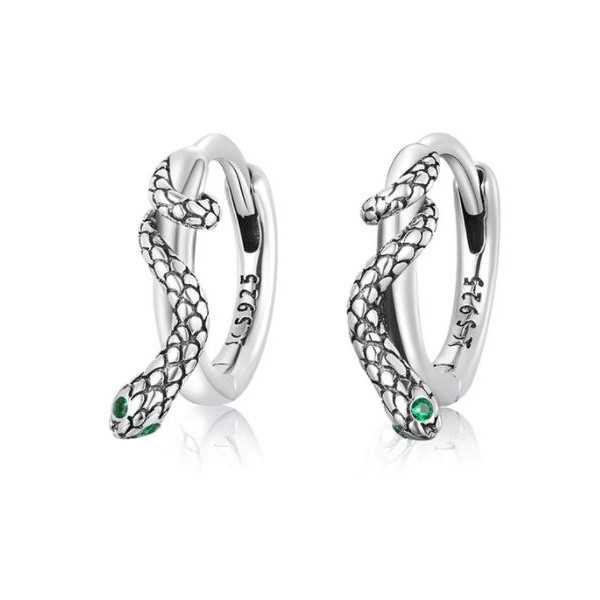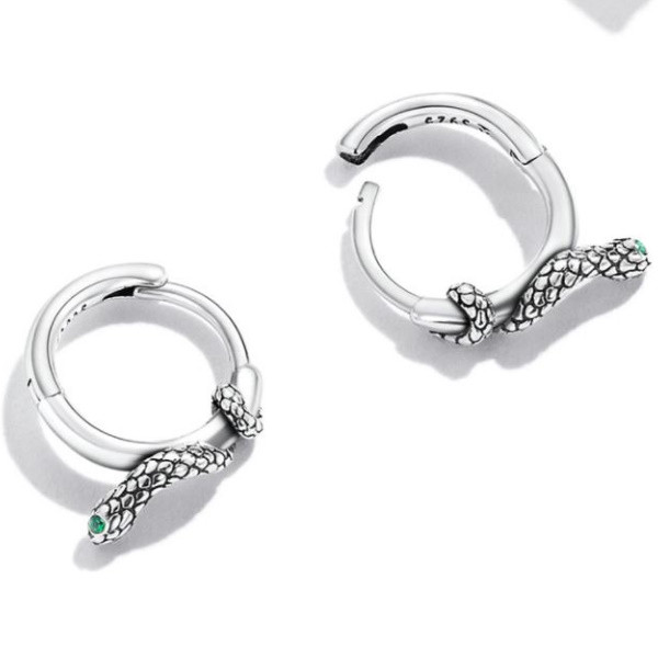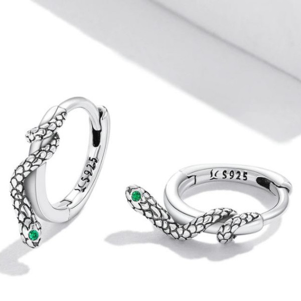 Dámske kruhové náušnice vyrobené zo striebra, s hadom zdobeným zeleným zirkónovým kryštálom. Veľkosť 1,2 × 0,4 cm, váha 1,6 g.