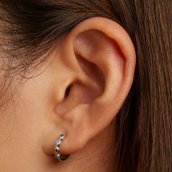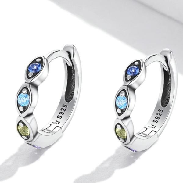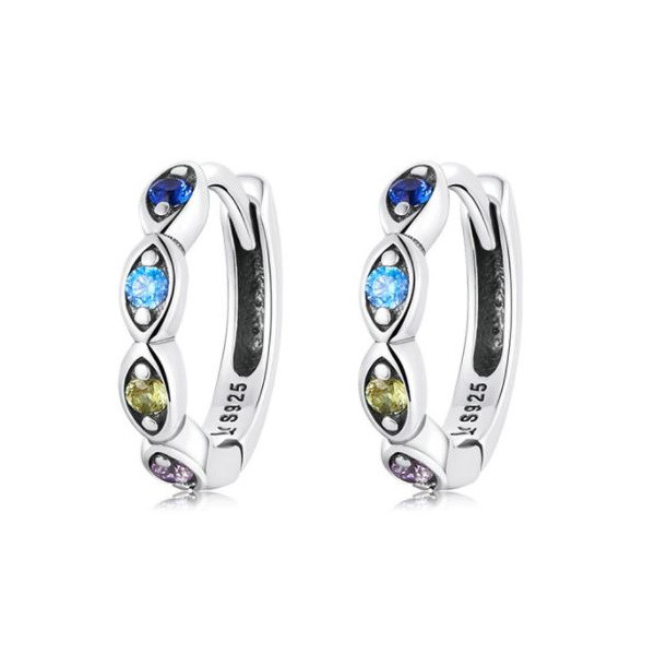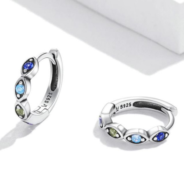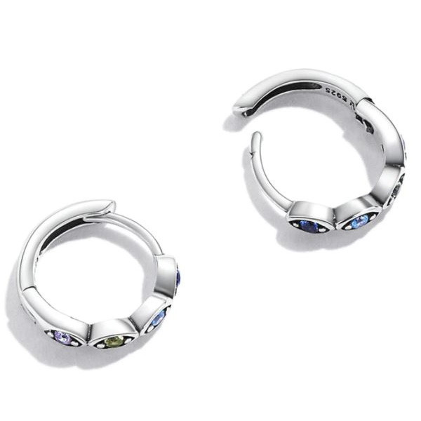 Dámske kruhové náušnice vyrobené zo striebra, zdobené farebnými zirkónovými kamienkami. Veľkosť 1,2 × 0,2 cm, váha 1,4 g.