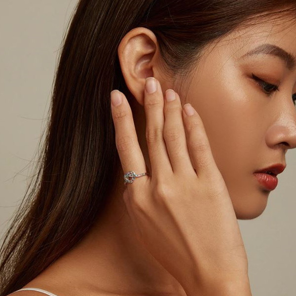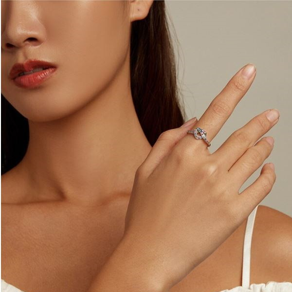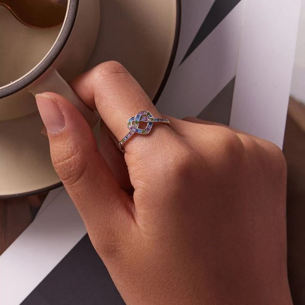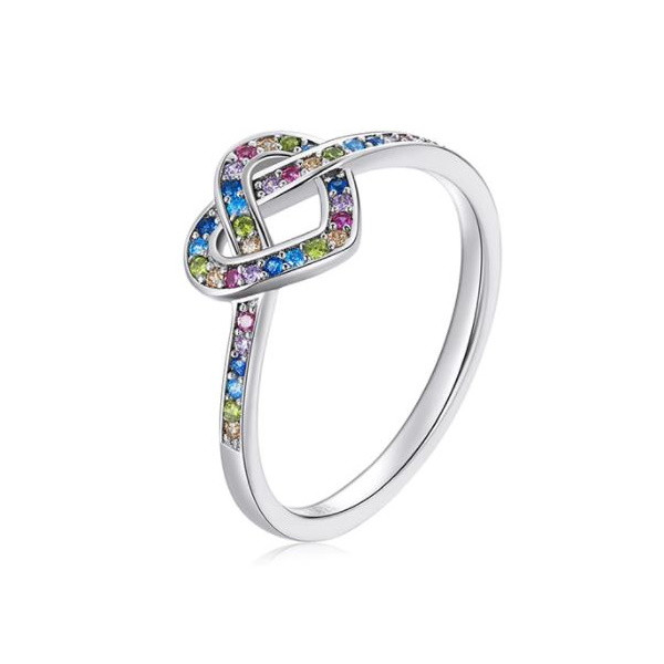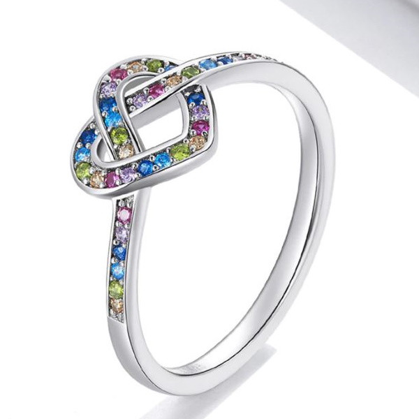 Dámsky prsteň vyrobený zo striebra, zdobený farebným zirkónovým kryštálom. Jeho hrúbka je 0,2 cm, váha 1,9 g, veľkosť srdca 0,8 × 0,9 cm.
