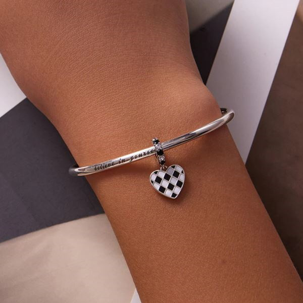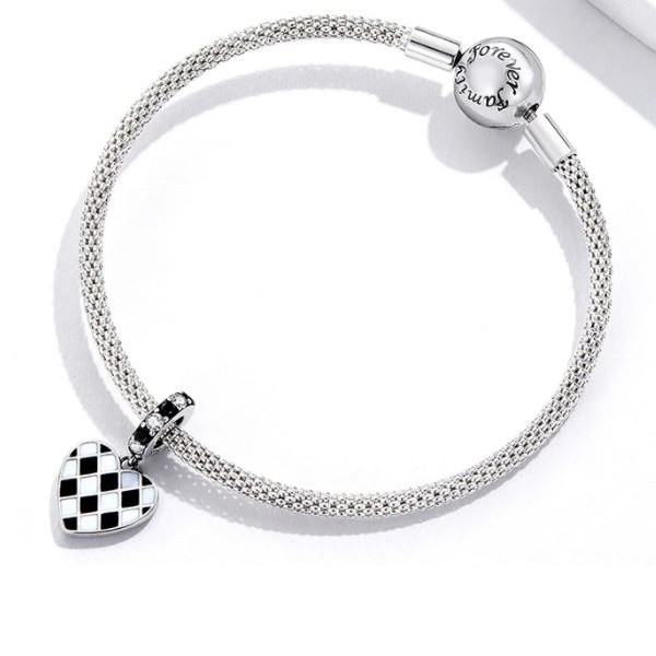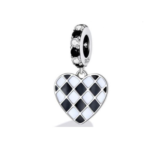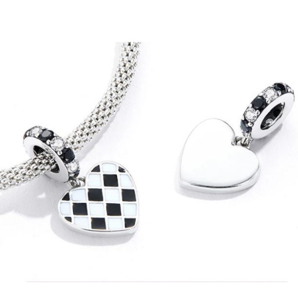 Srdiečkové kúzlo vyrobené zo striebra, zdobené čierno-bielym smaltom a zirkónovým kryštálom. Jeho rozmer je 2,1 × 1,2, priemer otvoru háčika je 0,5 cm. Hmotnosť 2,2 g Prívesok je kompatibilný s náramkami typu Pandora a Pandora.