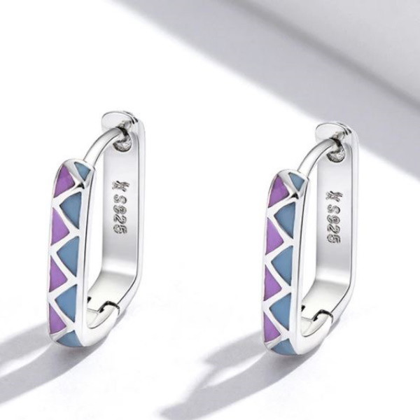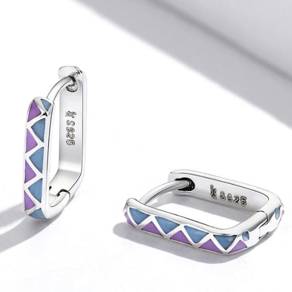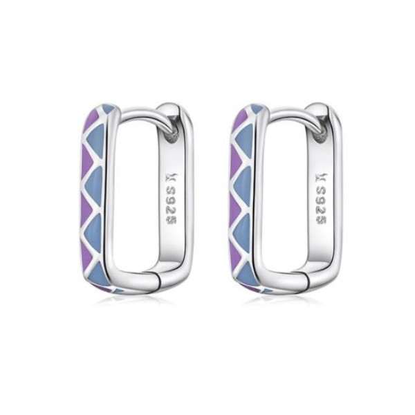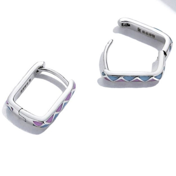 Štvorcové náušnice vyrobené zo striebra, zdobené farebným smaltom. Veľkosť 1,3 × 0,2 cm, váha 1,7 g.
