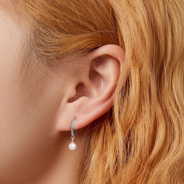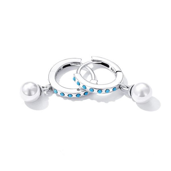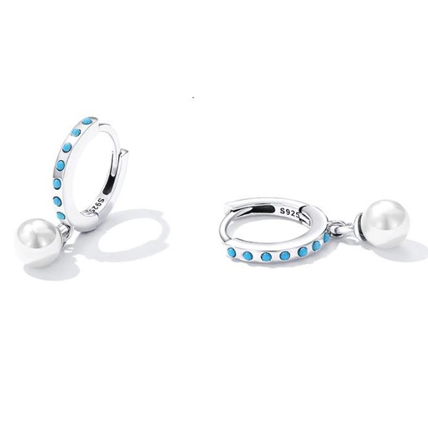 Strieborné kruhové náušnice zdobené bielymi perlami a tyrkysom. Veľkosť 2,1 × 0,5 cm, váha 2,3 g.