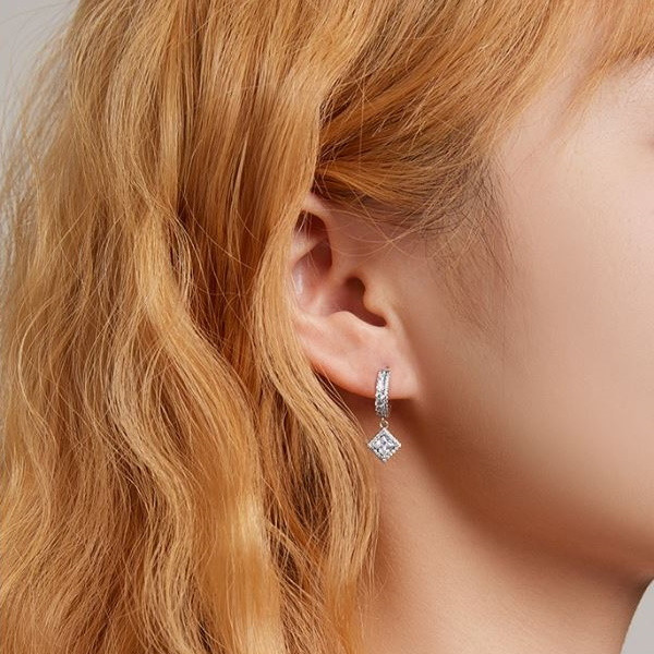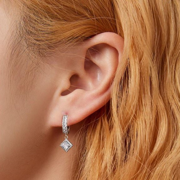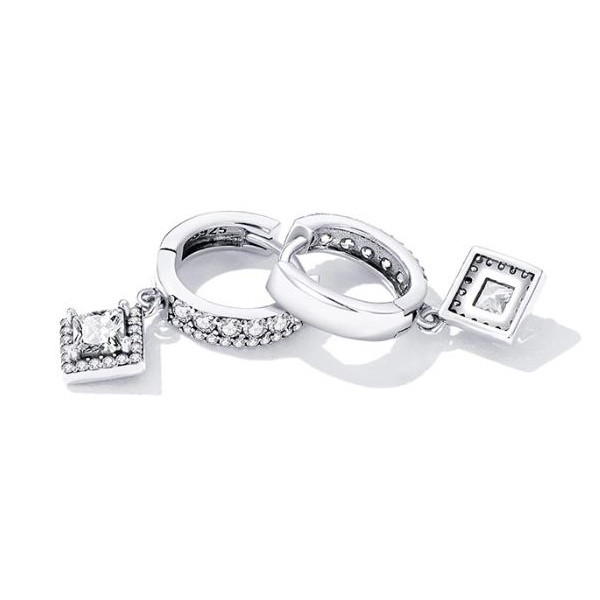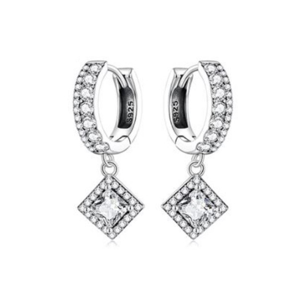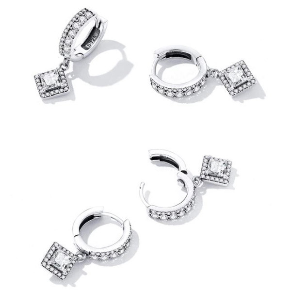 Kruhové náušnice zo striebra s obdĺžnikovým príveskom zdobeným bielymi zirkónovými kryštálmi. Veľkosť 2,4 × 0,9 cm, váha 3,6 g.